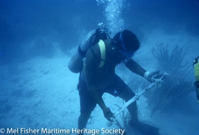 Underwater photo of Captain Demostines "Mo" Molinar (holding an encrusted cutlass) while being filmed by J. Barry Herron at Henrietta Marie shipwreck site.