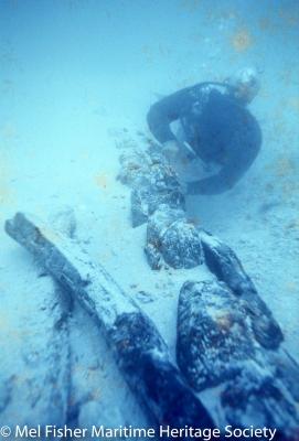 Underwater photo of archaeologist R. Duncan Mathewson III investigating hair pitch sample from the Henrietta Marie timbers at the shipwreck site.