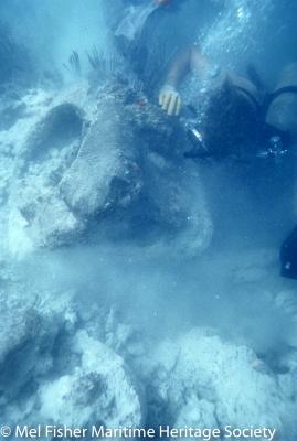 Underwater photo of a diver investigating the copper cauldron at the Henrietta Marie shipwreck site.