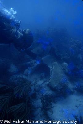 Underwater photo of a diver investigating the copper cauldron at the Henrietta Marie shipwreck site.