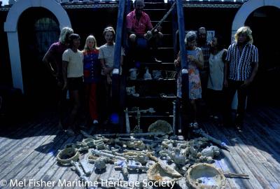 Photo of artifacts from one days work. Henrietta Marie shipwreck artifacts on the deck of the Treasure Salvors Inc. replica galleon with the crew. Bleth McHaley (black hair on left), Dolores "Deo" Fisher (left stair railing) and Mel Fisher on stairs.