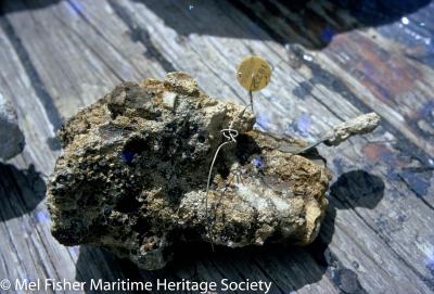 Photo of artifacts from one days work. Close-up of an unidentified Henrietta Marie shipwreck artifact (with glass beads encrusted to it) on the deck of the Treasure Salvors Inc. replica galleon.