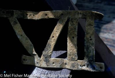 Photo of artifacts from one days work. Close-up of a draught marker recovered from The Henrietta Marie shipwreck on the deck of Treasure Salvors replica galleon.