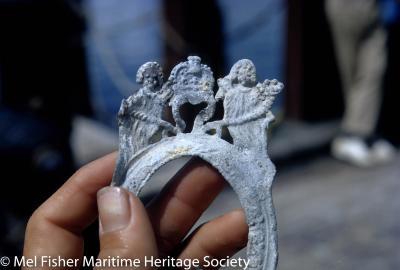 Photo of artifacts from one days work. Close up of lead mirror frame recovered from The Henrietta Marie shipwreck on the deck of Treasure Salvors Inc. replica galleon.