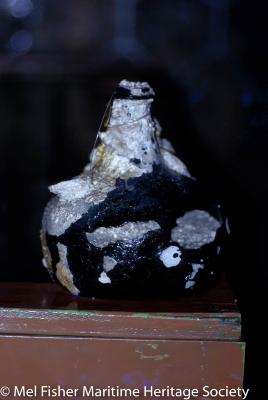Photo of an intact glass onion bottle from the Henrietta Marie shipwreck.