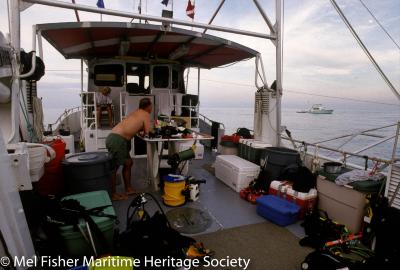 Back deck on the R/V Lakota (R/V Robo in the distance) anchored at the Henrietta Marie shipwreck site. RPM Nautical Foundation archaeologist Dan Brown (leaning) and National Geographic photographer Courtney Platt in the background.