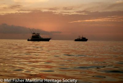 Sunset with R/V Robo (left) and R/V Lakota anchored at the