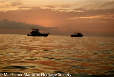 Sunset with R/V Robo (left) and R/V Lakota anchored at the Henrietta Marie shipwreck site.