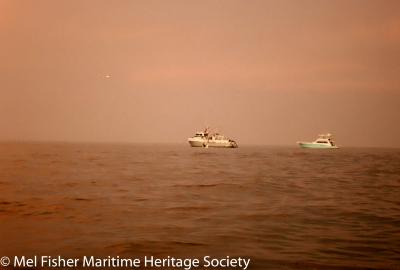 Sunset with R/V Robo (right) and R/V Lakota anchored at the Henrietta Marie shipwreck site.