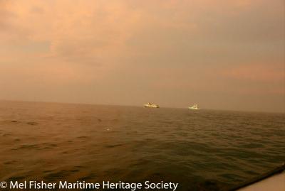 Sunset with R/V Robo (right) and R/V Lakota anchored at the