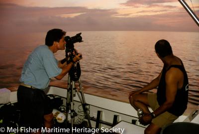 National Geographic photographer Courtney Platt photographing sunset at the Henrietta Marie shipwreck site. National Association of Black Scuba Divers' Michael Cottman enoying the sunset to his right.