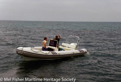 RPM Nautical Foundation captain/diver Cristian Swanson (right) shuttling Jim Goold from the R/V Lakota to the R/V Robo at the Henrietta Marie shipwreck site.