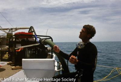 Mel Fisher Maritime Heritage Society archaeologist Corey Malcom preparing to dive the Henrietta Marie shipwreck.