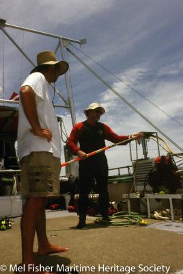 RPM Nautical Foundation captain Bruce Darby speaking to archaeologist David Moore before he dives the