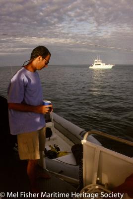 RPM Nautical Foundation captain Bruce Darby preparing to shuttle the crew between the R/V Lakota to the R/V Robo at the