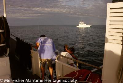 RPM Nautical Foundation captain Bruce Darby preparing to shuttle with the crew between the R/V Lakota to the R/V Robo at the Henrietta Marie shipwreck site.
