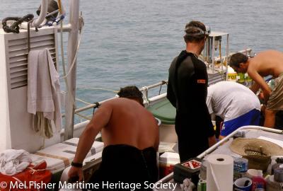 Left to right: RPM Nautical Foundation captain/diver Cristian Swanson, Mel Fisher Maritime Heritage Society archaeologist Corey Malcom, MFMHS archaeological assistant Brian Blanco, and RPM Nautical Foundation captain Bruce Darby preparing dive equipment on the back deck of the R/V Lakota at the Henrietta Marie shipwreck site.