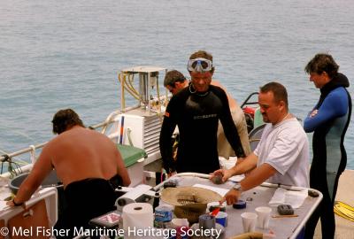 Left to right: RPM Nautical Foundation captain/diver Cristian Swanson, RPM Nautical Foundation captain Bruce Darby, Mel Fisher Maritime Heritage Society archaeologist Corey Malcom, MFMHS archaeological assistant Brian Blanco, and National Geographic photographer Courtney Platt preparing dive equipment on the back deck of the R/V Lakota at the Henrietta Marie shipwreck site.