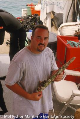 MFMHS archaeological assistant Brian Blanco (holding an ivory tusk recovered from the shipwreck) on the back deck of the R/V Lakota at the Henrietta Marie shipwreck site.