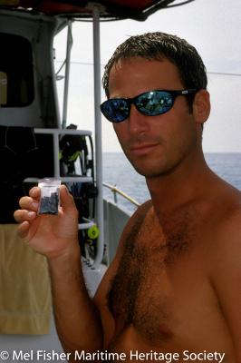 RPM Nautical Foundation captain Bruce Darby holding a bag of glass trade beads recovered from the