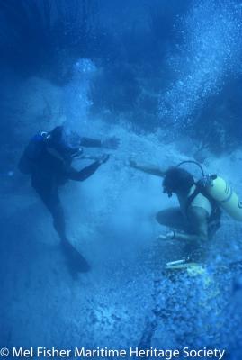 Underwater photo of an unidentified diver and Captain Demostines "Mo" Molinar (left, holding an encrusted cutlass) at the Henrietta Marie shipwreck site.