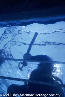 Underwater photo of Demostines "Mo" Molinar (holding an encrusted cutlass) standing on a dive ladder at Henrietta Marie shipwreck site.