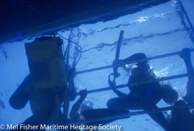 Underwater photo of Demostines "Mo" Molinar (holding an encrusted cutlass) standing on a dive ladder while being filmed by J. Barry Herron at Henrietta Marie shipwreck site.