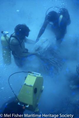 Underwater photo of an unidentified diver and Captain Demostines "Mo" Molinar (right) holding a stack of encrusted pewter basins being filmed by J. Barry Herron at Henrietta Marie shipwreck site.