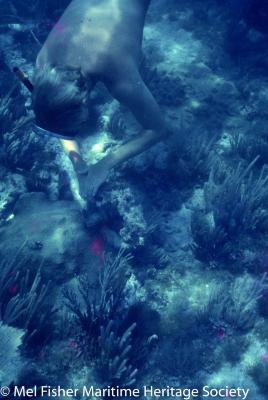 Underwater photo of a diver investigating an encrusted anchor at the Henrietta Marie shipwreck site.