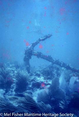 Underwater photo of an encrusted anchor on New Ground Reef near the Henrietta Marie shipwreck site.