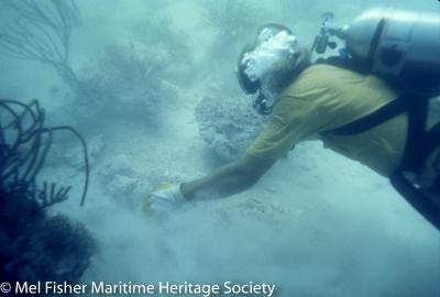Underwater photo of a diver investigating an area near the Henrietta Marie shipwreck site.