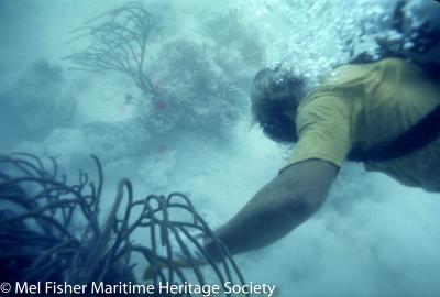 Underwater photo of a diver investigating an area near the Henrietta Marie shipwreck site.