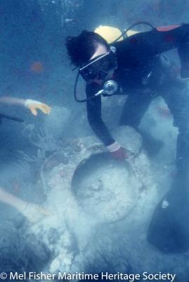 Underwater photo of a diver investigating the copper cauldron at the Henrietta Marie shipwreck site.