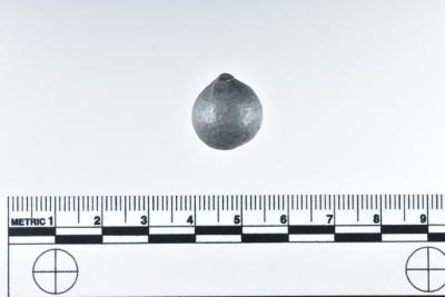 1.5 x 1.4 cm. 19.61 grams. One of ten arquebus shot (1986.008.2970a--j). Originally from a batch of various musket and arquebus shot accessioned under two numbers: 1986.008.2026 and 1986.008.2027.
