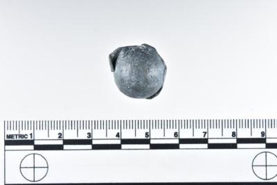 2.1 x 1.8 x 1.7 cm. 31.96 grams. Musket shot. One of ten shot (9 arquebus, 1 musket 1986.008.2977a--j). Originally from a batch of various musket and arquebus shot accessioned under two numbers: 1986.008.2026 and 1986.008.2027.
