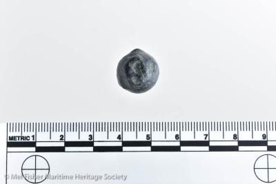 1.5 x 1.4 cm. 18.63 grams. Arquebus shot. One of ten shot (7 arquebus, 3 musket 1986.008.3015a--j). Originally from a batch of various musket and arquebus shot accessioned under two numbers: 1986.008.2026 and 1986.008.2027.